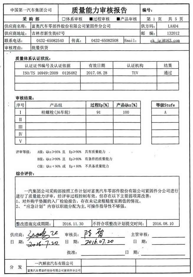 A级供应商审核报告--一汽集团